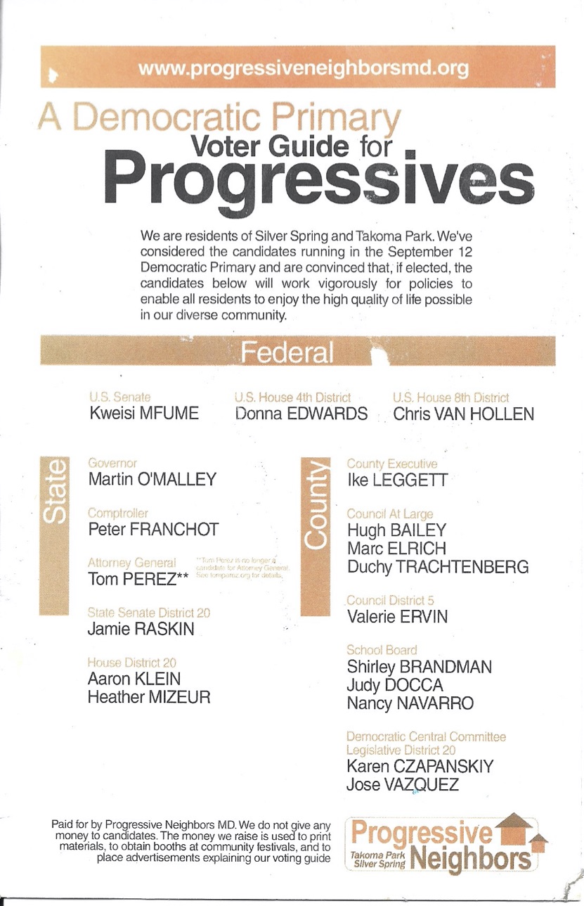 In 2006 we endorsed Jamie Raskin who ran against Ida Rubin the 32 year incumbent State Senator and beat her handily. We also endorsed Marc Elrich for County Council.