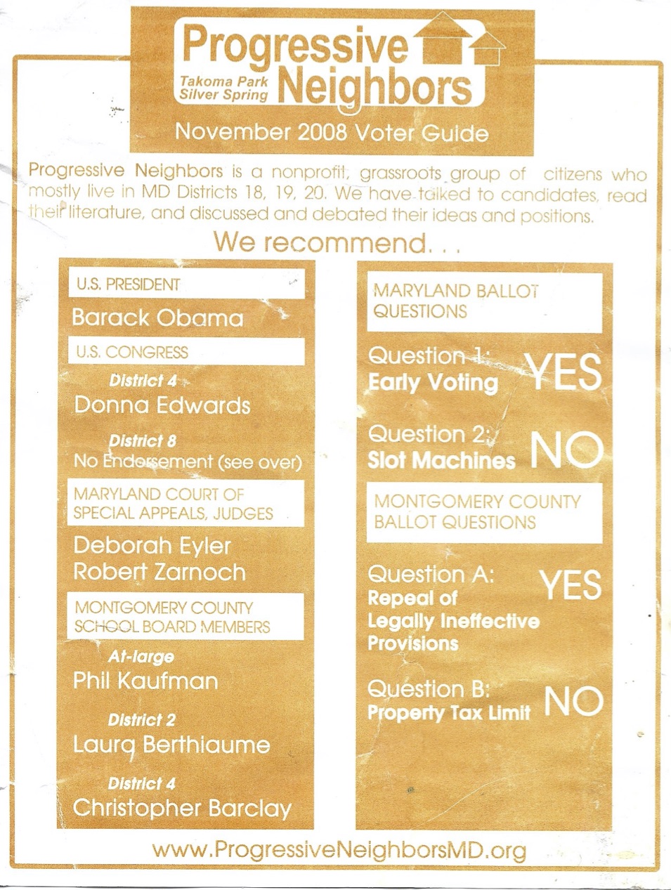 In 2008 we endorsed Barack Obama for President and Donna Edwards for Congress both of whom won.