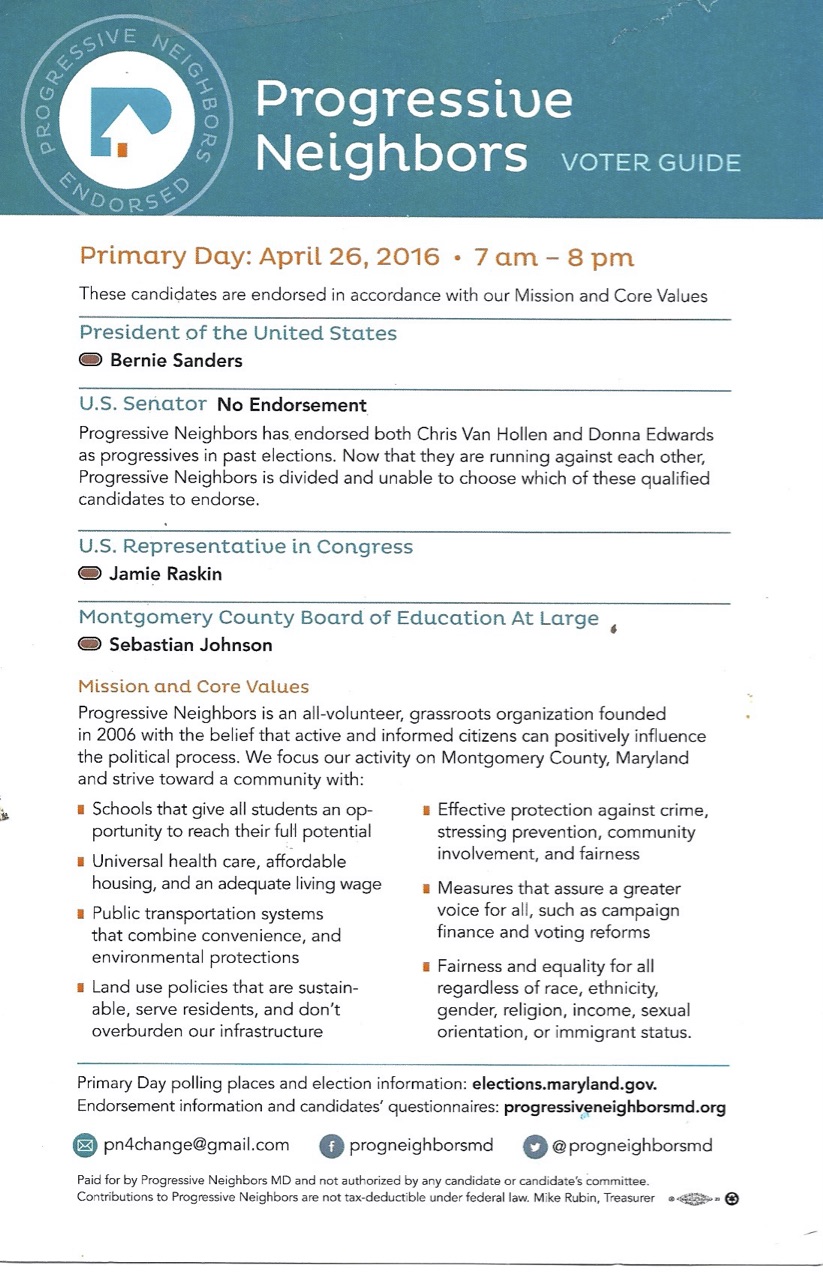 In 2016 we endorsed Bernie Sanders for President and Jamie Raskin for Congress. Jamie won his primary against several other candidates who were much better funded and then won the general election to become Congressman for the 8th Congressional District.